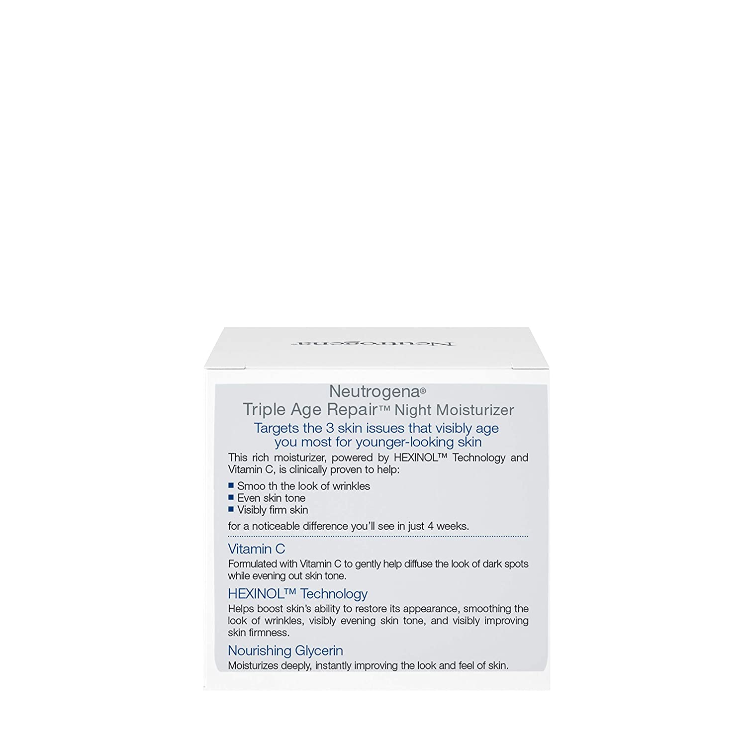Wake up to younger-looking skin with Neutrogena Triple Age Repair Anti-Aging Night Cream with Vitamin C & Glycerin. This night facial moisturizer targets three skin issues commonly associated with aging—wrinkles, uneven skin tone and firmness—for a difference you'll see in just four weeks. Made with vitamin C, glycerin and shea butter, the anti-wrinkle cream contains Hexinol technology and is clinically proven to help smooth the look of wrinkles, even skin tone, reduce the appearance of dark spots, and visibly improve skin's firmness. For best results, apply this anti-aging nighttime moisturizer evenly over face and neck every night after cleansing as part of your at-home skincare routine