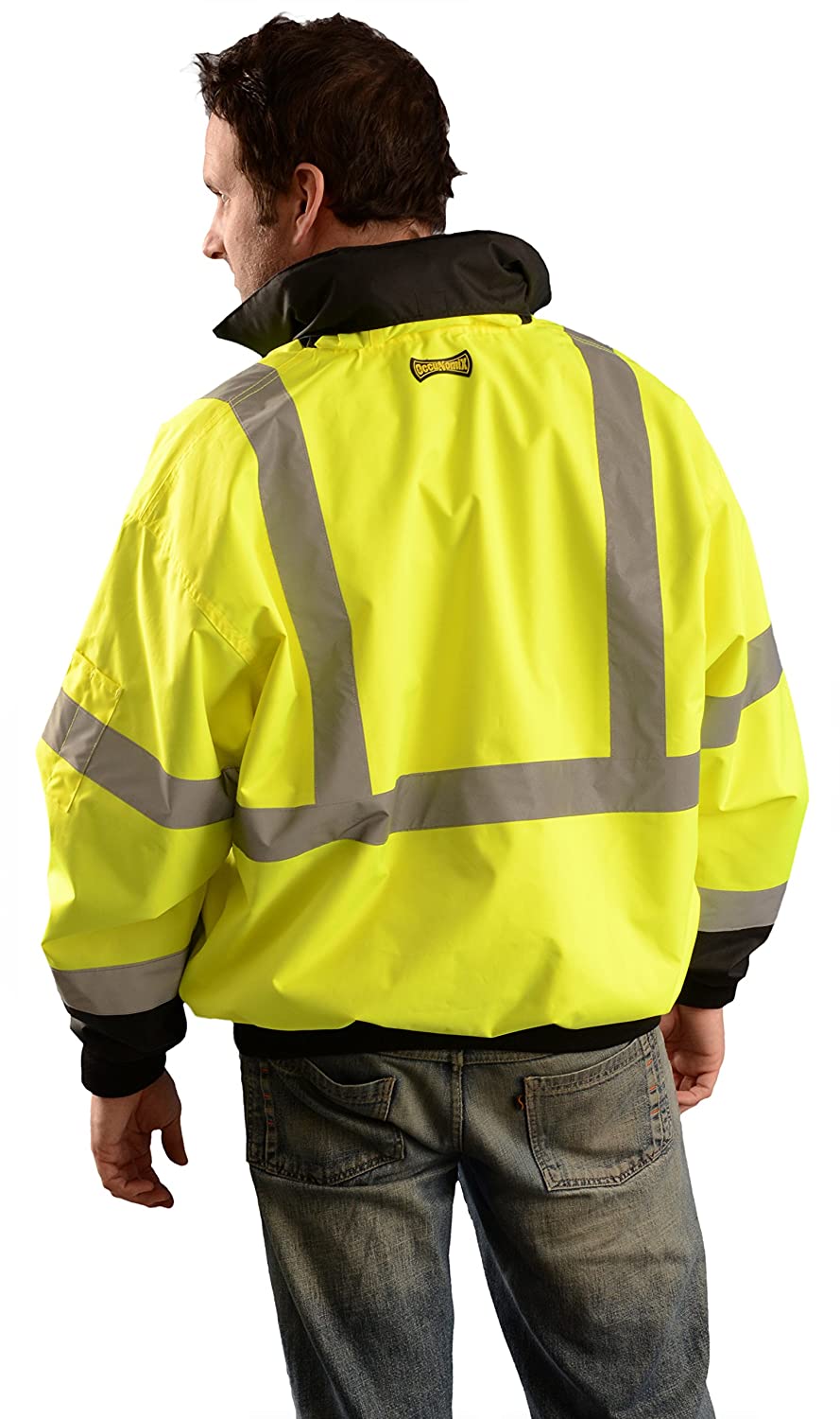 Occunomix 3-Way Bottom Bomber Jacket Is Made Of 100% Ansi Polyester With An Elegant Polyurethane Coating Has 100% Black Polyester Fleece Zip-Out Liner Which Can Be Worn As A Separate Jacket For Superior Comfort And Durability. Class 3 Jacket Features 2" Silver Reflective Tape With Sealed Seams To Render Magnificent Visibility And Protection Against Water. Jacket Has Black Bottom Front, Collar, Cuffs, Waistband And A Rollaway Hood. It Has 2 Outer, 1 Inner, 1 Radio And Left Sleeve Pencil Pocket With 2 Compartments And 2 Mic Tabs. Ansi 107 Type R, Class 3 Compliant.