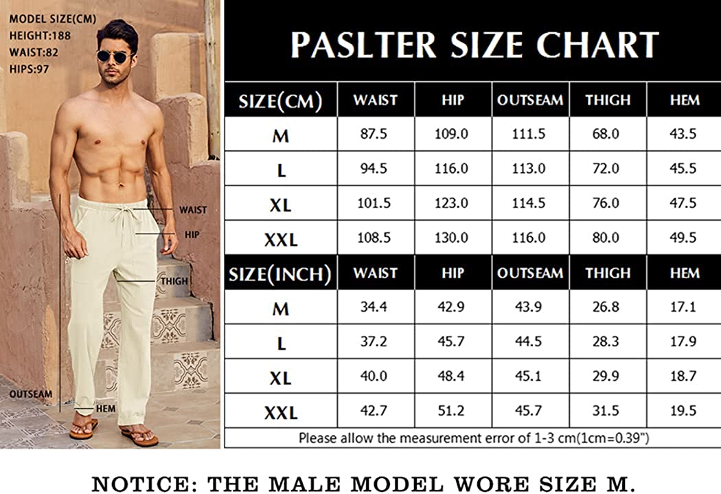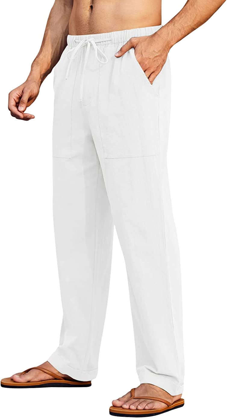 PASLTER Mens Casual Linen Pants Loose Fit Straight-Legs Elastic Drawstring Waist Summer Beach Yoga Long Pants