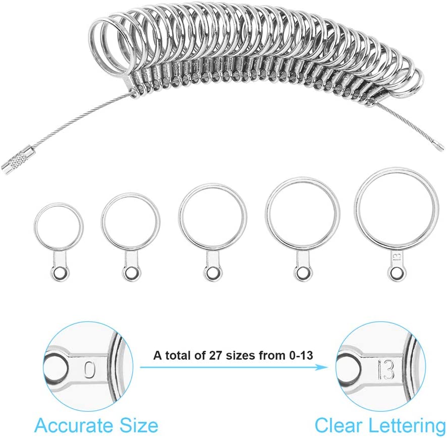 Our finger ring sizer measuring tool has 27 Sizes, US ring size 0-13 with half size ( "-" Means 1/2 size,"-10" is 10.5, "-11" is 11.5 etc).