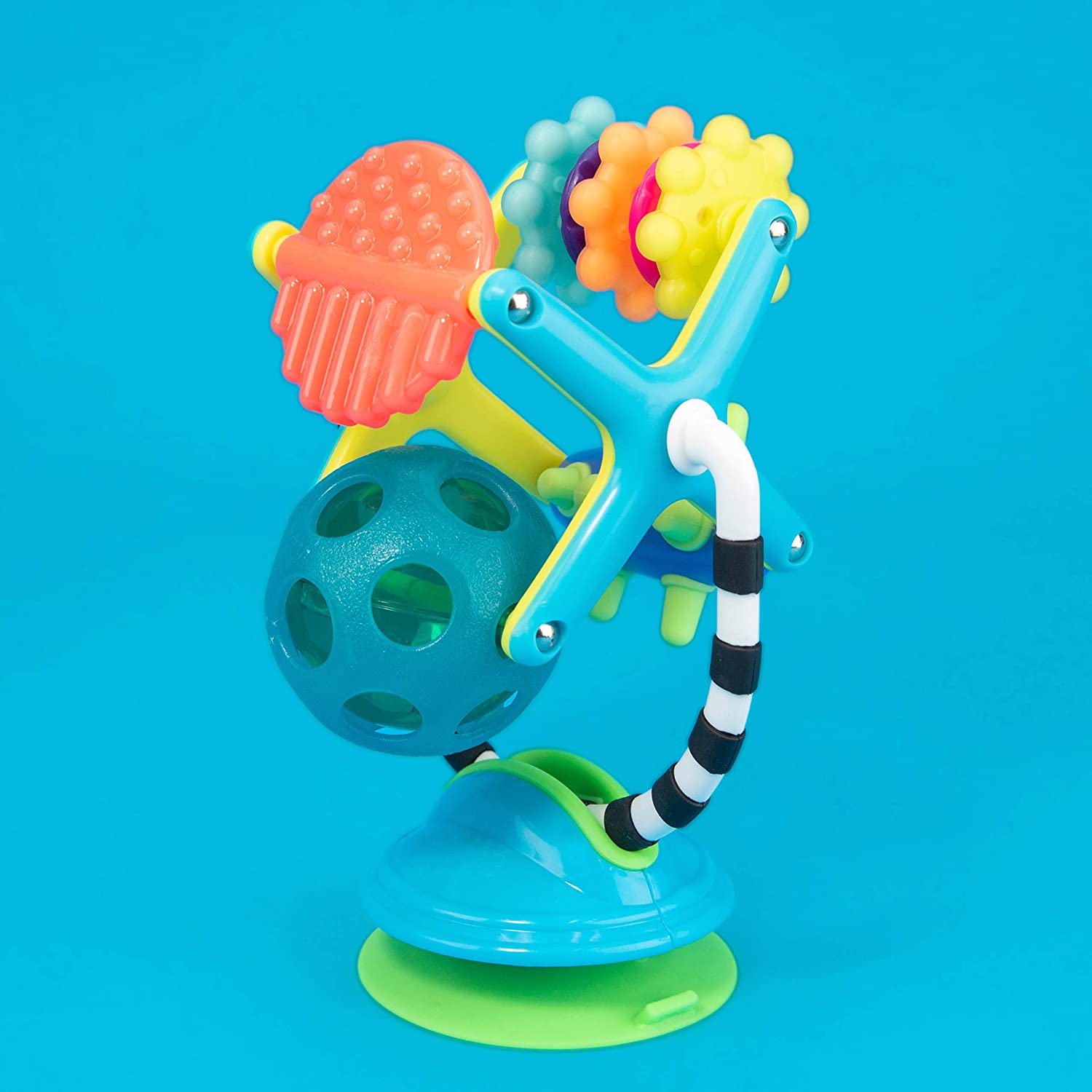 Use the suction cup base to attach the station to a flat surface and watch baby explore the many features of this station. The spinning wheel encourages baby to reach, tug and bat, strengthening hand-eye coordination. Each feature on the wheel spins individually when baby bats at it, introducing baby to cause & effect. The beads trapped within the clear structures allow baby to connect the sound to sight. The toy's handle is multi-textured, perfect for mouthing. This 2-in-1 toy can be suctioned to a table or high chair tray, or removed from the base for floor play.
