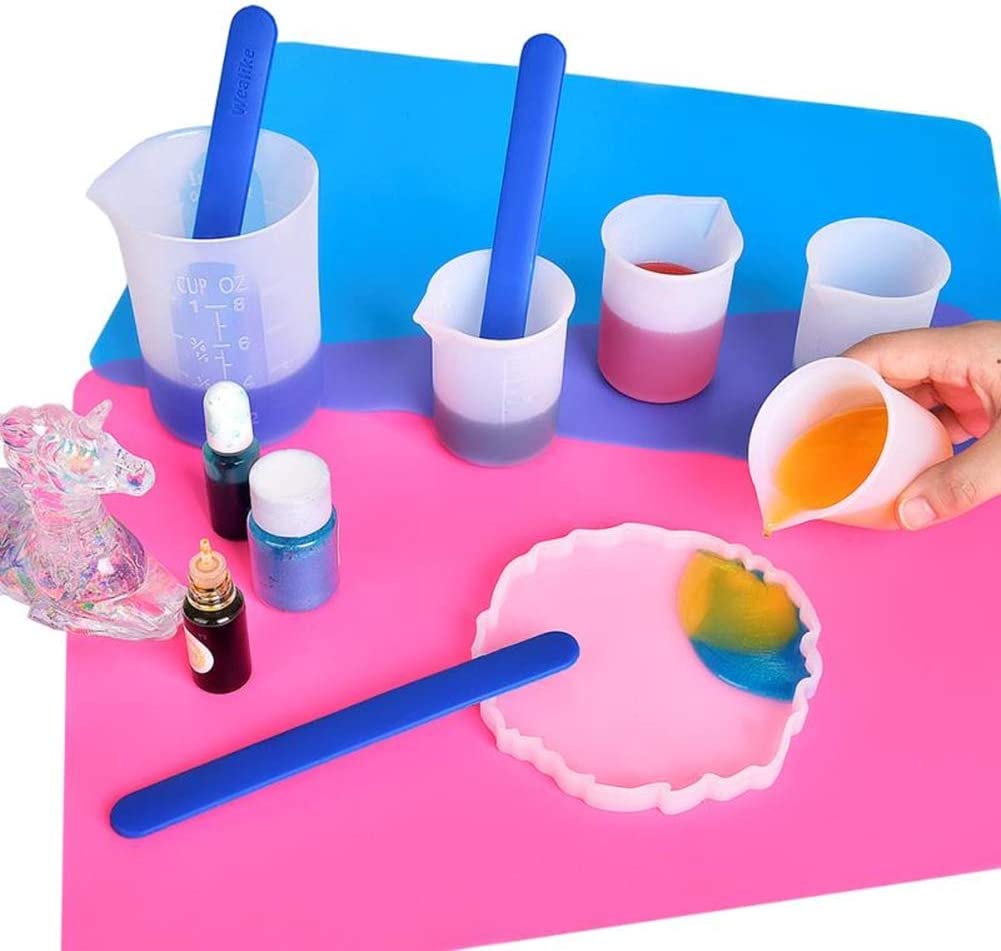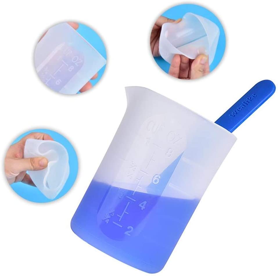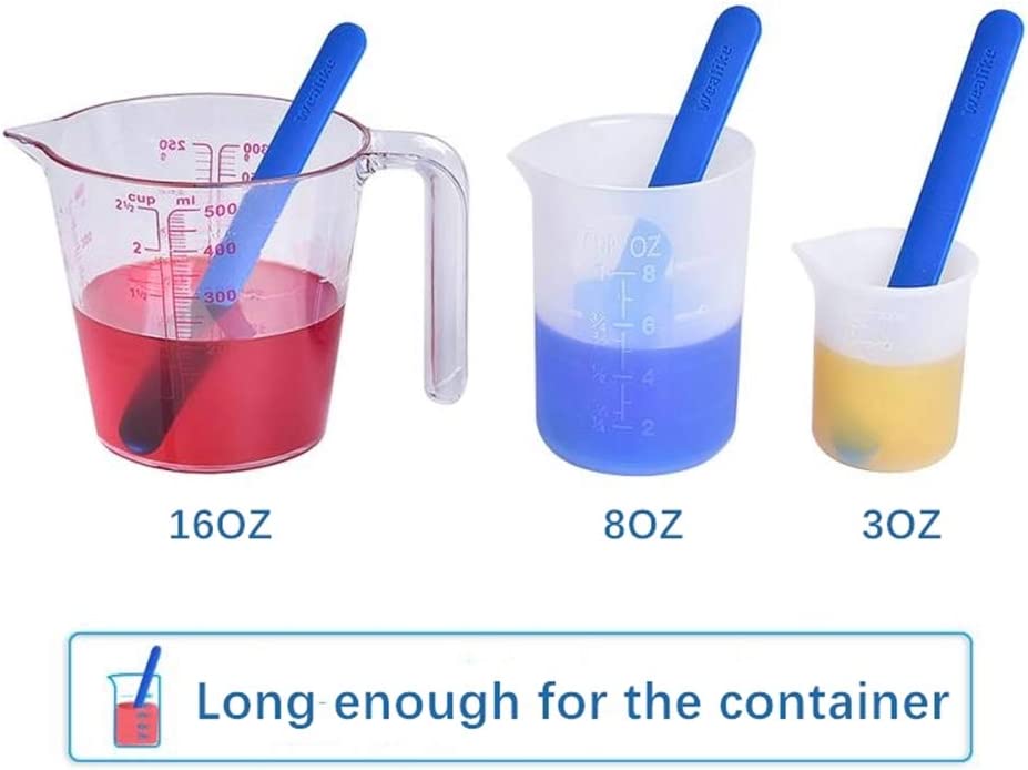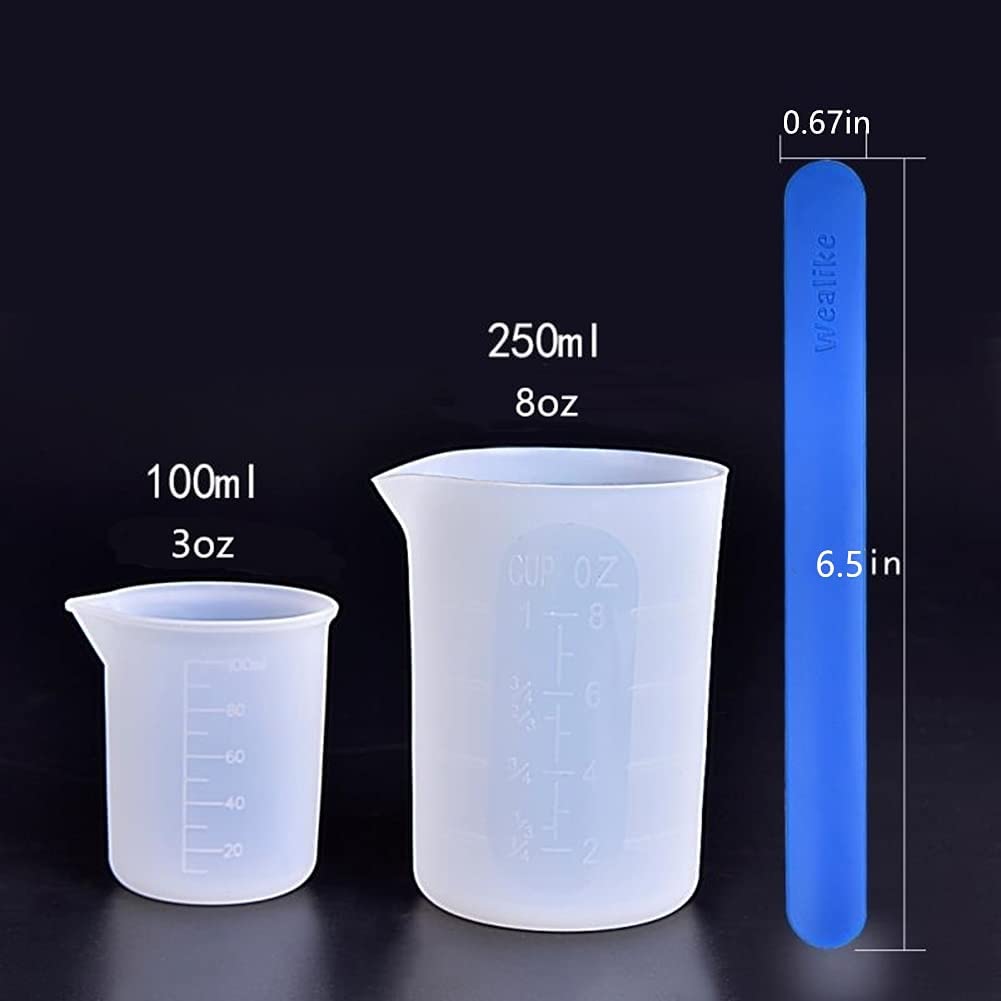 PACKAGE INCLUDED: 1pcs 250ml silicone cup+4pcs resin mixing cups +2 pcs silicone stire sticks Silicone measuring cups set: 1. Suitable tools for measuring, pouring and mixing small batches of casting resin, paint, acrylic, stain or other DIY projects. 2. Easy to clean: Non-stick surface convenient to clean, just let the resin harden inside the cups, let it dry and scrape out the wipe them down. 3. Made of premium silicone, durable and reusable, better than plastic disposable cups. silicone stire sticks: 1. Smooth Finish with Round Ends,Smooth surface easy to clean off with a paper towel ,able to use the silicone sticks over & over. 2. Not only can be used for epoxy resin diy, also perfect for testing, mixing or skin care products such as masks, creams, and so on.