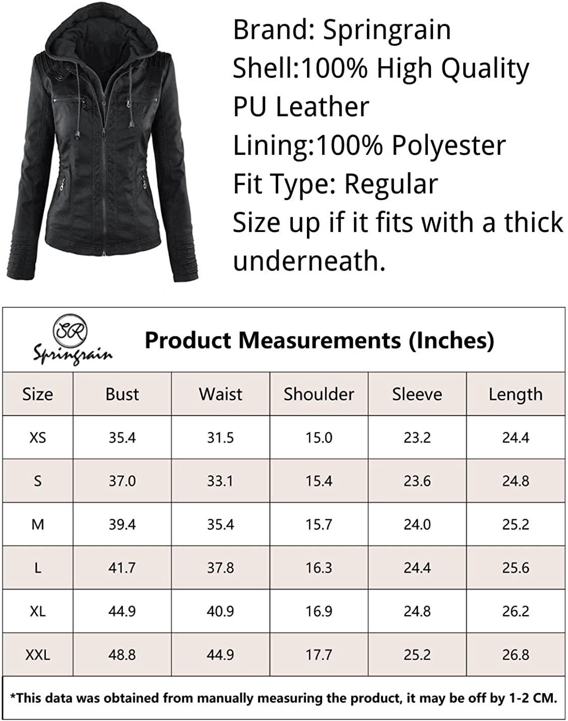Springrain Women's Casual Stand Collar Detachable Hood PU Leather Jacket