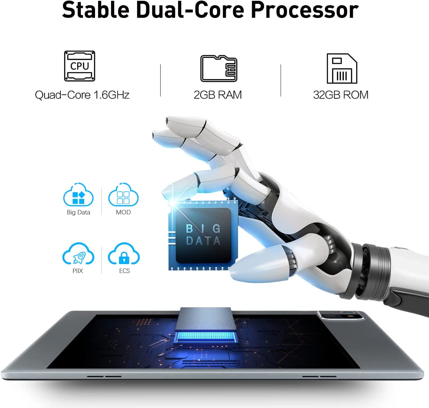2 GB RAM, 32 GB ROM (128GB expandable), Quad-Core processor, Dual camera (2MP Front camera,5MP rear camera), Gravity acceleration sensor,Anti-Collision Covermaking, 802.11b/g/n+BT4.0 WiFi support, 6000MAh powerful battery, One year return and exchange service.