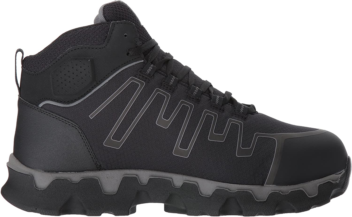Men's Timberland Pro, Powertrain Sport Mid Alloy EH Work Boot. These work boots will provide the ultimate in protection and comfort. Perfect for industrial or warehouse work. Metal free upper design with manmade and fabric featuring an alloy safety toe for lightweight protection Lace up closure for a secure fit with a padded tongue and collar for added support Fabric lining with antimicrobial treatment for odor control with a cushioned footbed for added comfort Anti-fatigue technology built in the outsole helps absorb shock and returned energy to key ones of the foot Electrical safe design with Timberland Pro 24/7 comfort suspension for ultimate comfort Slip, oil- and abrasion-resistant with static dissipative and non-marking rubber outsole. Heel Height of 1.50 inches