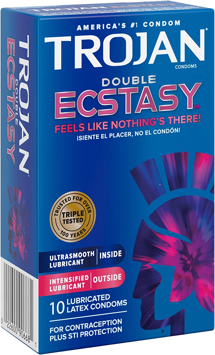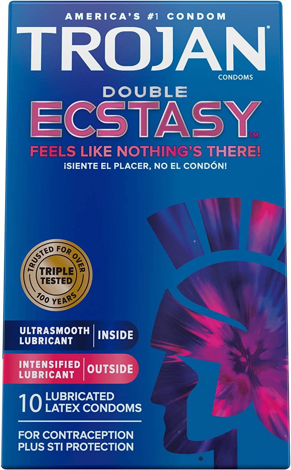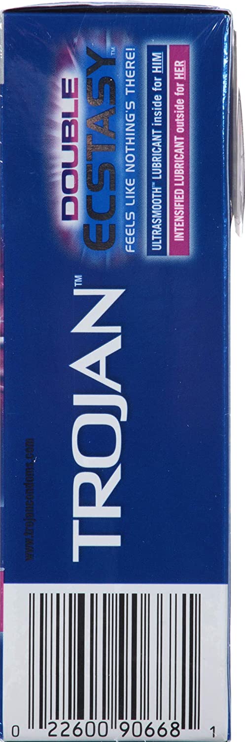 TROJAN Double ECSTASY Condoms feature a unique design that lets you feel the pleasure, not the condom. Feels like nothing's there! Deep ribs at the base and end increase stimulation, while the comfort shape allows freedom of movement for an enhanced sexual experience. The UltraSmooth lubricant inside for him and the intensified lubricant outside for her help maximize the pleasure for both partners. TThey’re made from a premium quality latex and are electronically tested to help ensure reliability. These condoms reduce the risk of unintended pregnancy and sexually transmitted infections (STIs) while you play. Includes one 10 count box of TROJAN Double ECSTASY Condoms. TROJAN Brand condoms are America's #1 condom, trusted for over 100 years. The TROJAN Brand promotes a safe, healthy and fun sex life. From condoms to vibrators to lubricants, TROJAN Brand is dedicated to delivering innovative, high-quality products that offer pleasure and protection.