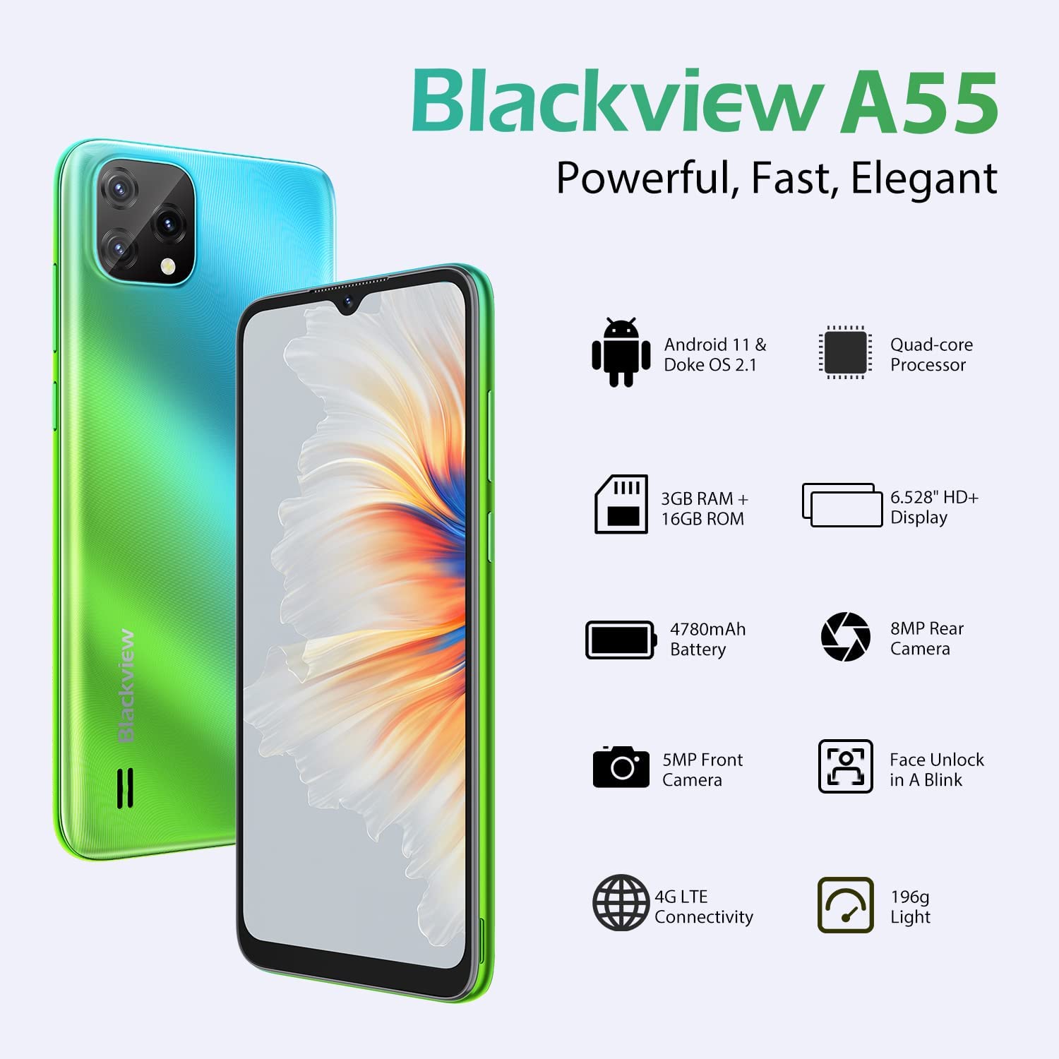 Unlocked Smartphones, Blackview A55, 2022 Unlocked Cell Phones Android 11, 6.528" HD+, 3GB RAM 16GB ROM, 4780mAh High Capacity Battery, 3-Card Slots, 4G Dual SIM, 8MP+5MP,Face ID, T-Mobile Phone,Black