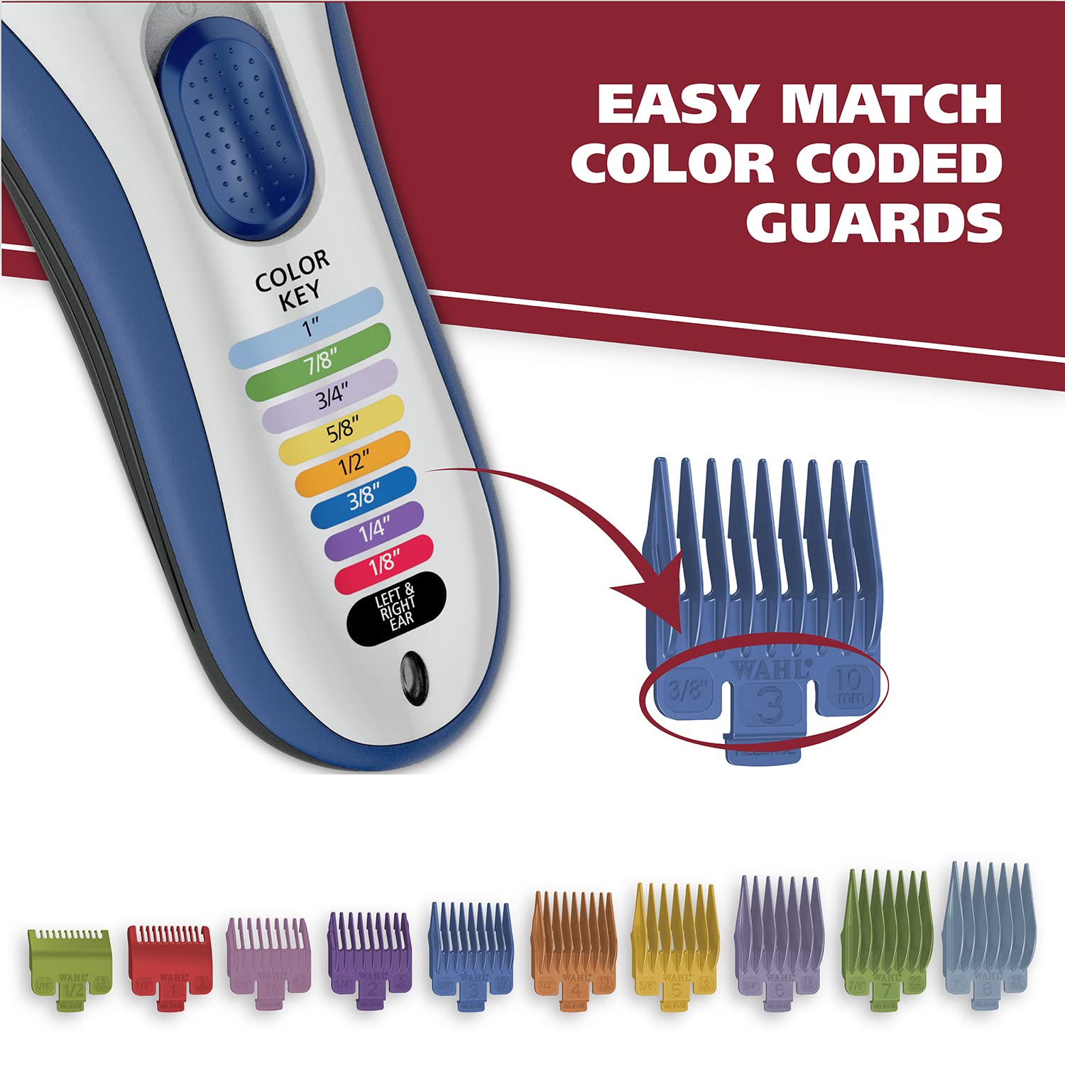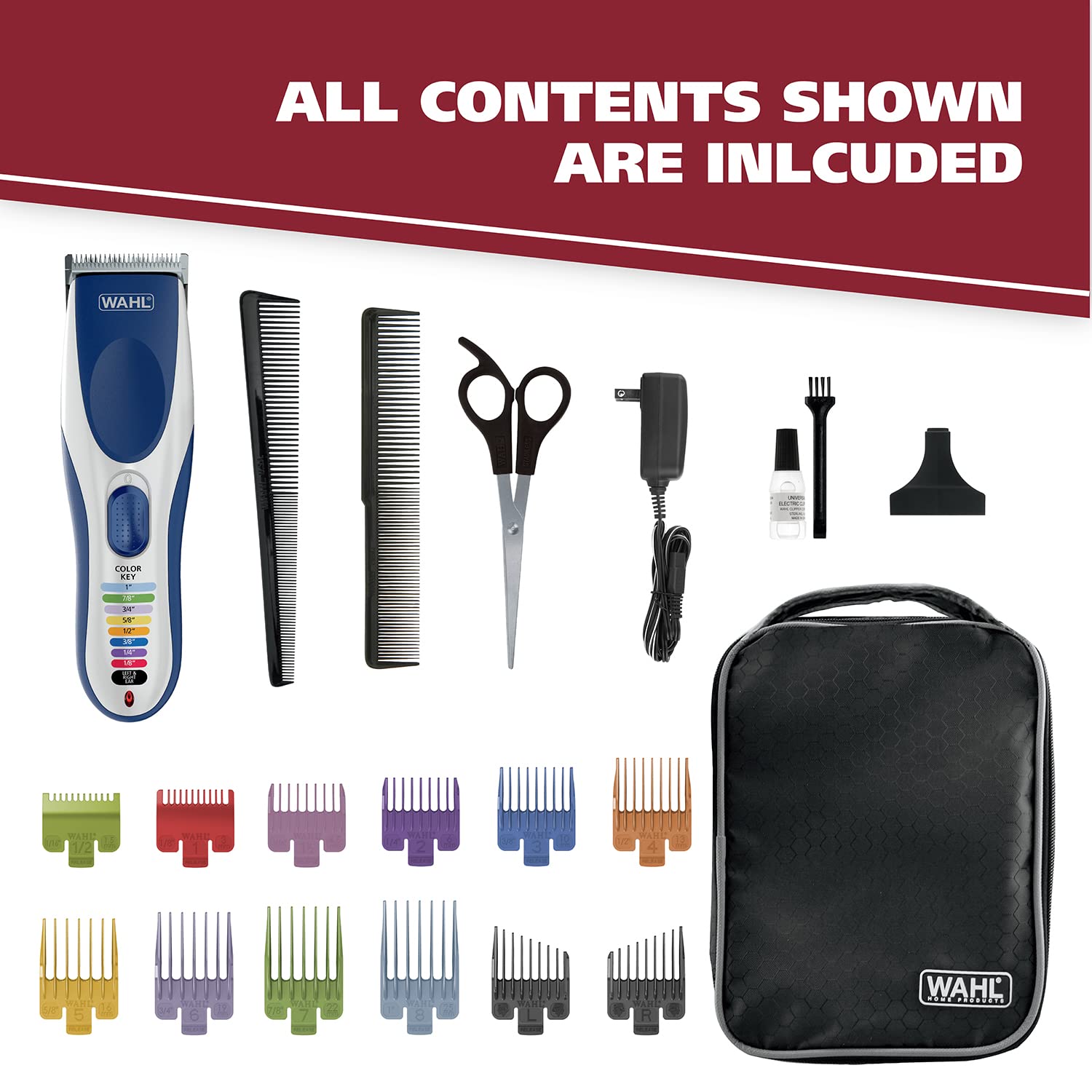 The Wahl Color Pro Cordless Clipper kit features color-coded combs that make it quick and easy to find the right comb size. The convenient color code guide on the clipper helps make it easy to identify the right size and comb color in seconds. Finding and remembering everyone’s favorite hair length is easier than ever. Corresponding the correct comb to the right cutting length is simple with our easy-to-see attachment guards. With a variety of cutting lengths, adjusting the trim length is pain free. Quickly reference the color key on the face of the clipper and attach the corresponding-colored clipper comb attachment. The clipper powerful, long-lasting rechargeable battery with a run time of up to 60 minutes. Clipper can be used with or without a cord for ultimate convenience. Includes a self-sharpening stainless-steel blade with outstanding cutting performance. The stainless-steel blade can also easily be removed for easy cleaning. Color Pro Cordless is rechargeable and wireless. Cord/Cordless allows you to use the clipper on battery or when it's charging. Since our blades are removable and rinseable they are easy to clean. Simply run them under water to wash away excess clippings and trimmings. The Color Pro Cordless color-coded haircutting kit includes the clipper with blade guard, a complete set of color-coded attachment guards, haircutting accessories, and full color instructions with step-by-step guidance for an easy goof-proof at-home haircut. A premium hard storage case is also included for added convenience. Worldwide voltage (110 - 240V) for universal use at home or internationally. Product in packaging may not be the same as photo due to continuous improvements to the product. Note: We test our clippers for cutting performance prior to packaging with a hygienic fiber. We do our best to clean the product to remove any testing particles, but it is possible a few may remain. They are not hair and can be simply wiped off.