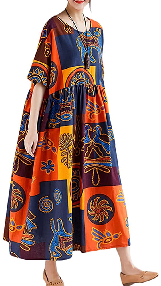 Women Loose Casual Cotton Linen Dress Floral Boho Maxi Dress Contrast House Robes Half Sleeves Plus Size