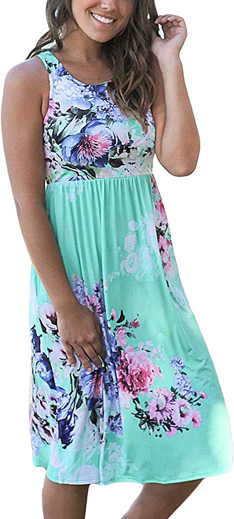 Women Summer Sleeveless Floral Print Racerback Midi Sun Dresses with Pocket