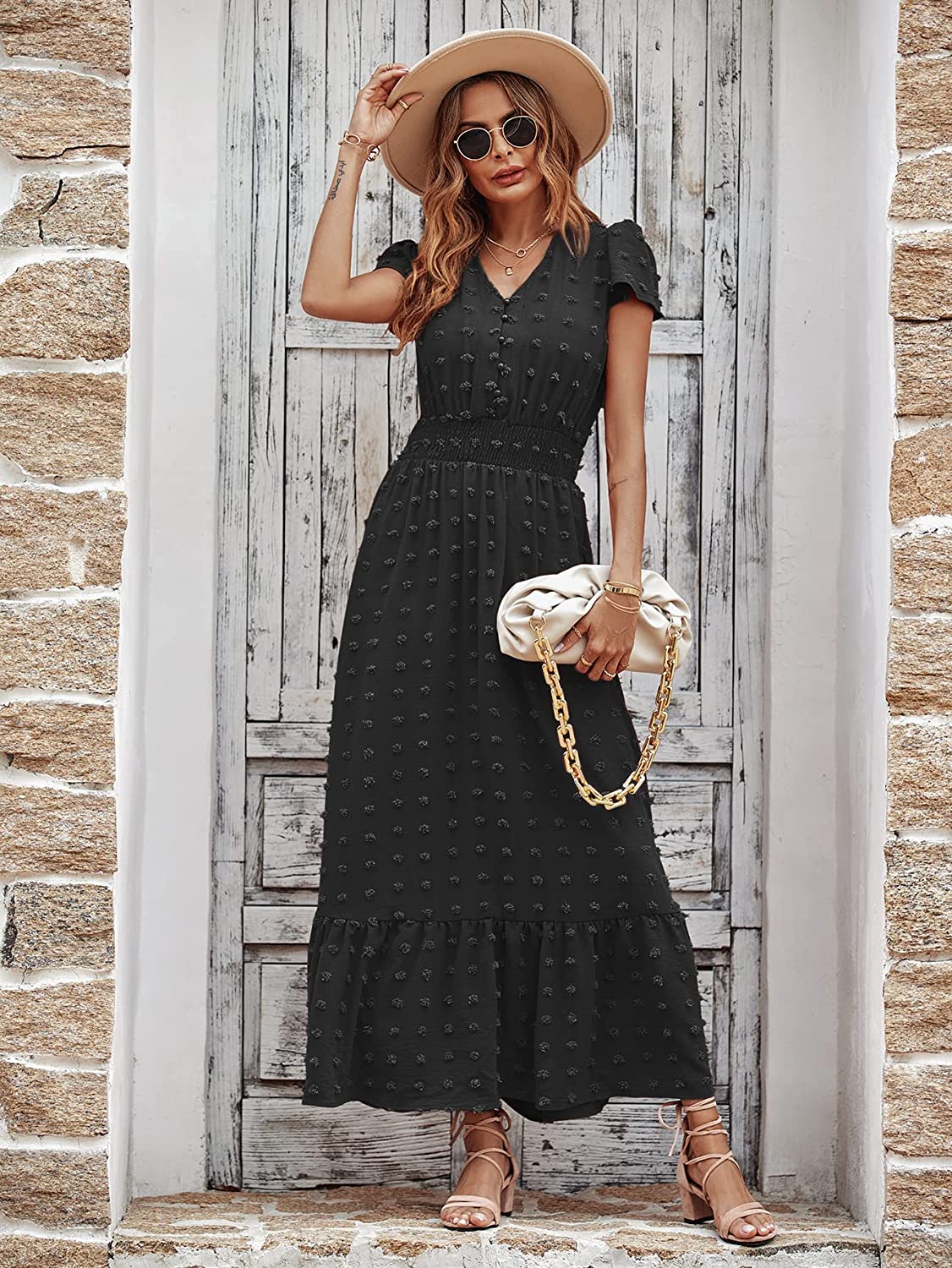 Women's Boho Dress Short Sleeve V Neck Swiss Dot Ruffle Tiered Maxi Dress Smocked Cocktail Dress