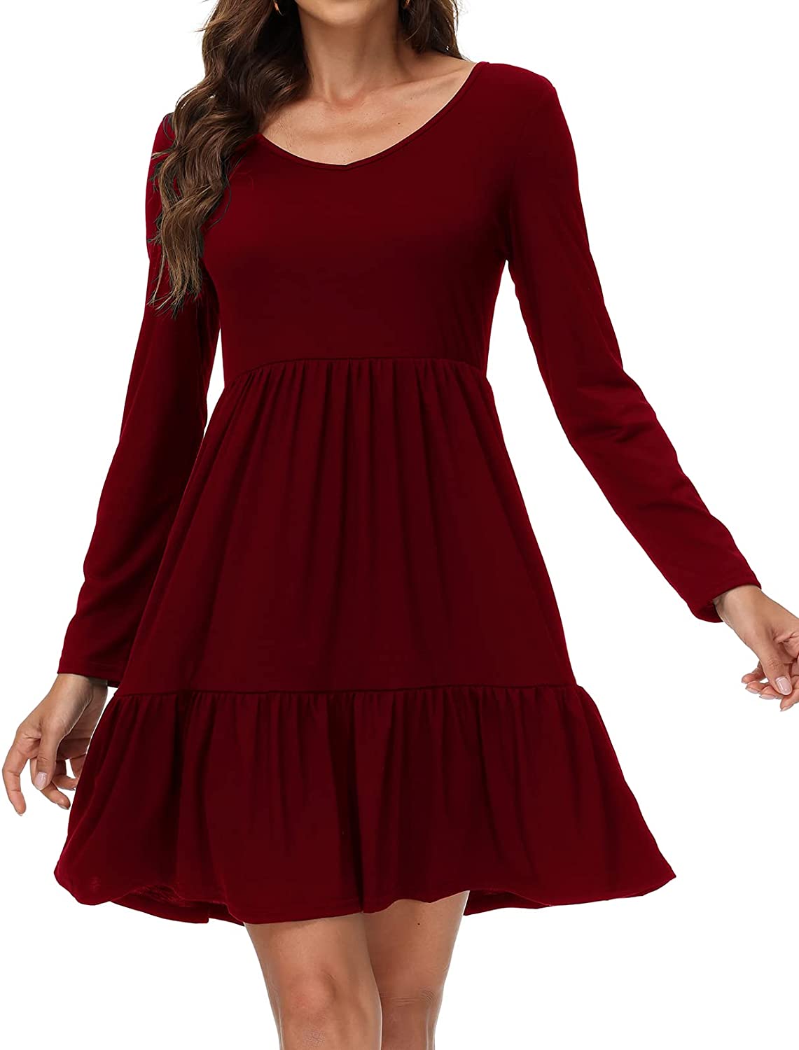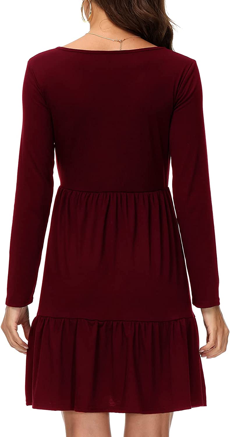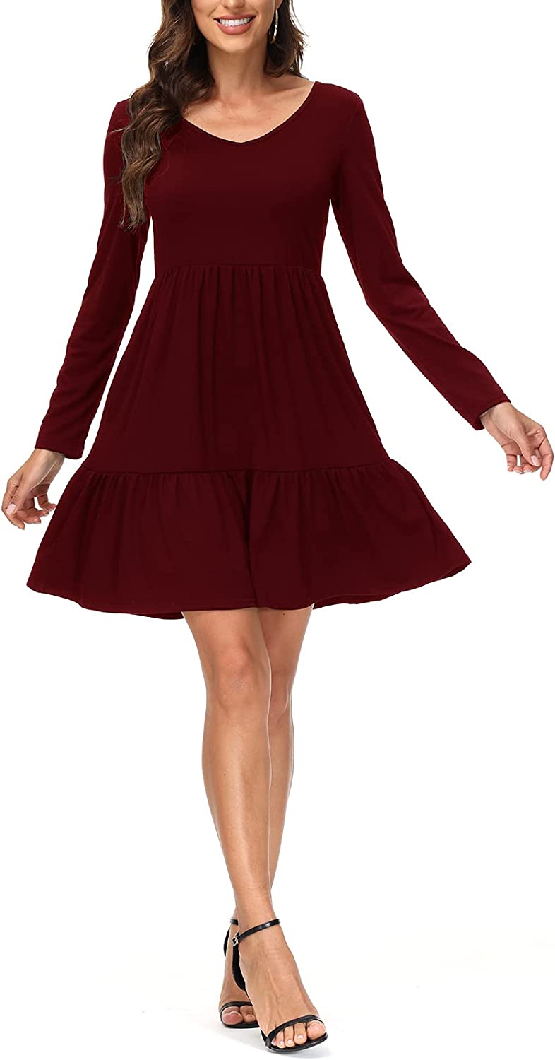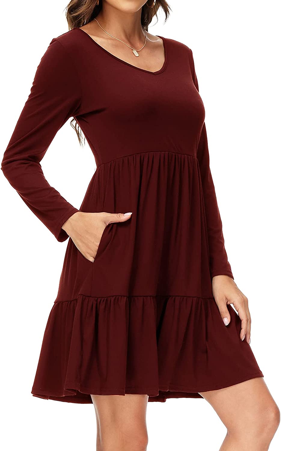 Women's Casual Black Long Sleeve Fall Dresses V Neck Spring Ruffles Ruched Dress with Pockets