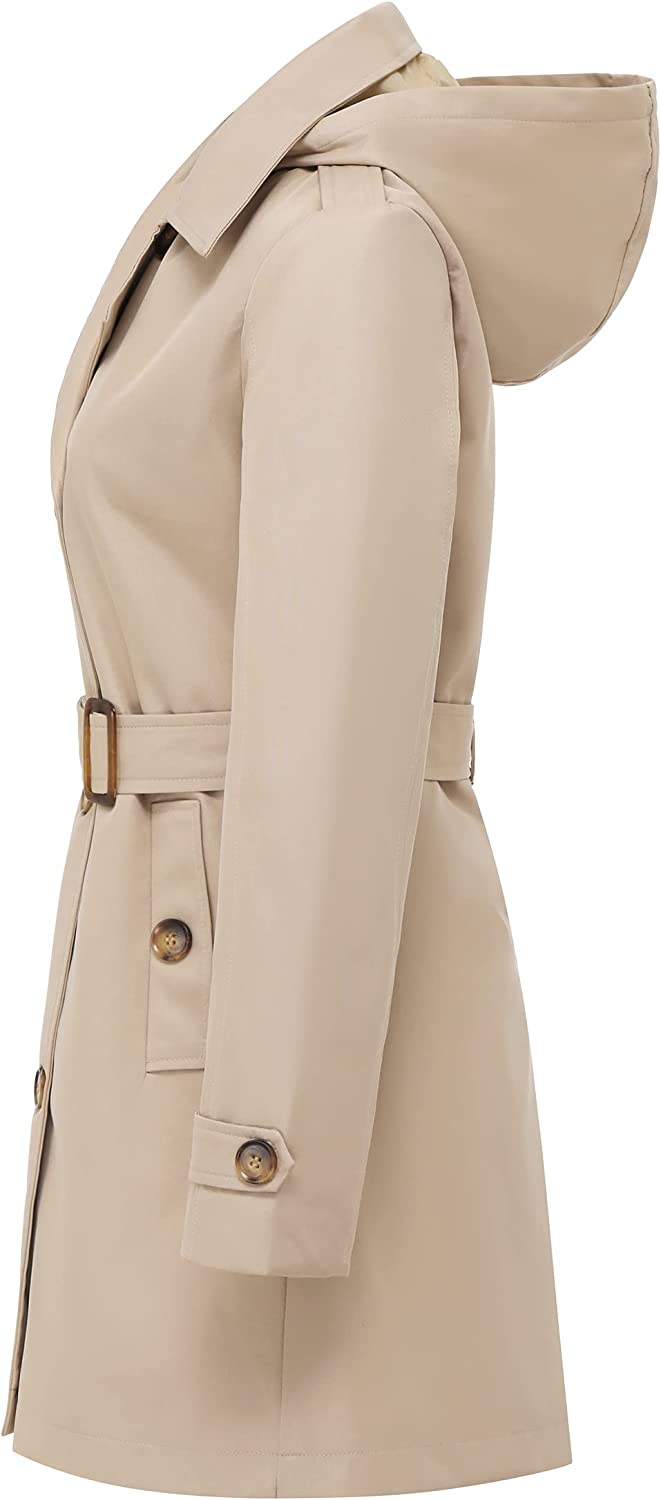 Women's Double Breasted Trench Coats Mid-Length Belted Overcoat Long Dress Jacket with Detachable Hood