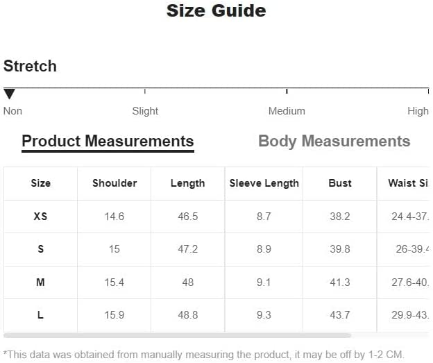 Small:Shoulder:15", Length:47.2", Sleeve Length:8.9", Bust:39.8", Waist Size:26-39.4", Cuff:24.4"