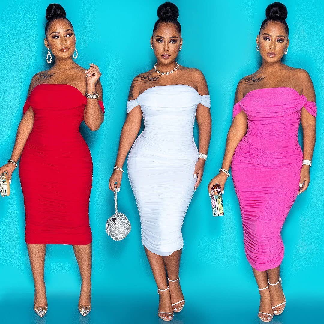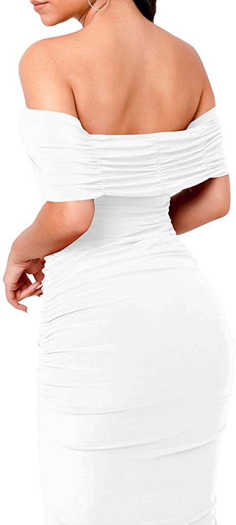 Women's Ruched Off Shoulder Short Sleeve Bodycon Midi Elegant Cocktail Party Dress