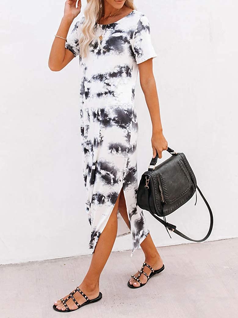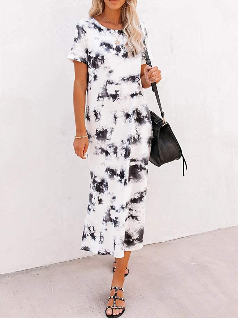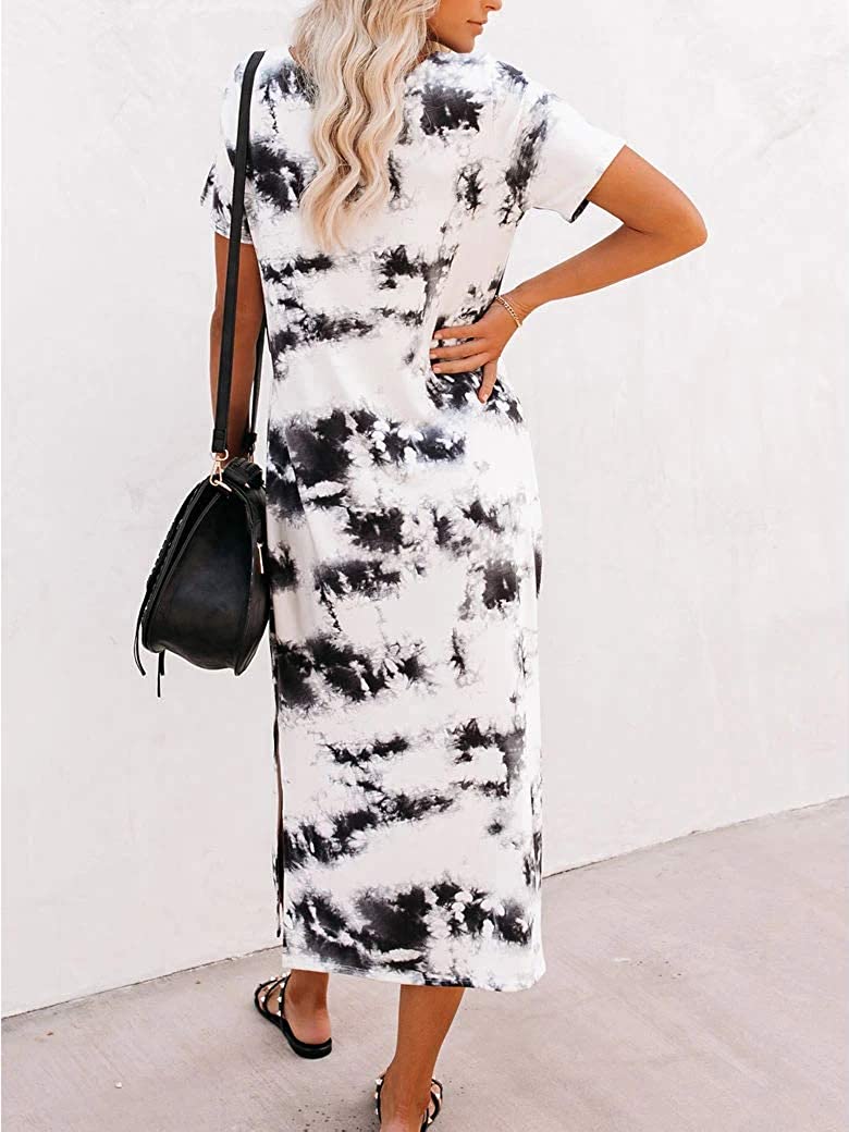 Women's Short Sleeve Split Maxi Dress Casual Plain Tie Dye Print Tshirt Long Dresses with Pockets