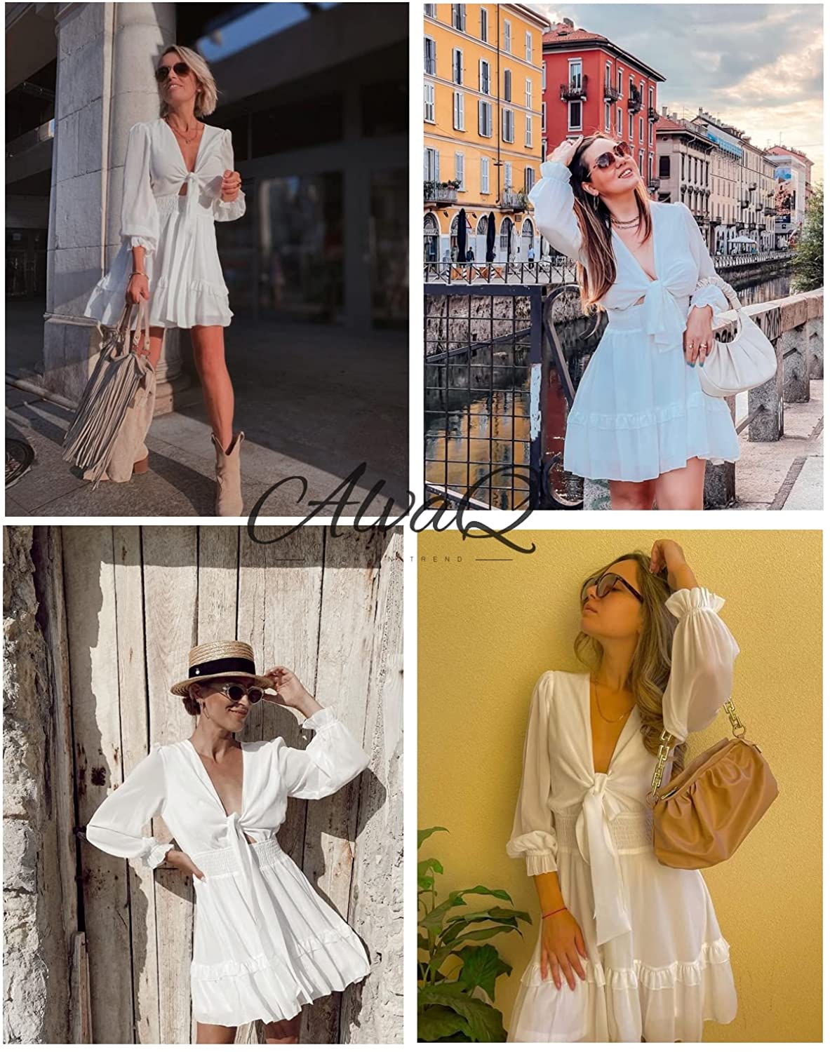 Womens Spring Summer Knot Front V Neck Ruffles Long Sleeve Floral Print Swing Mini Dress