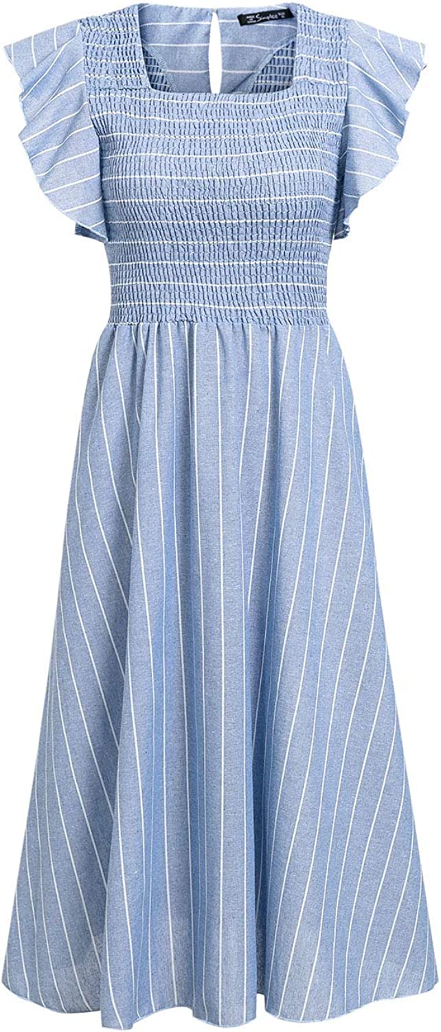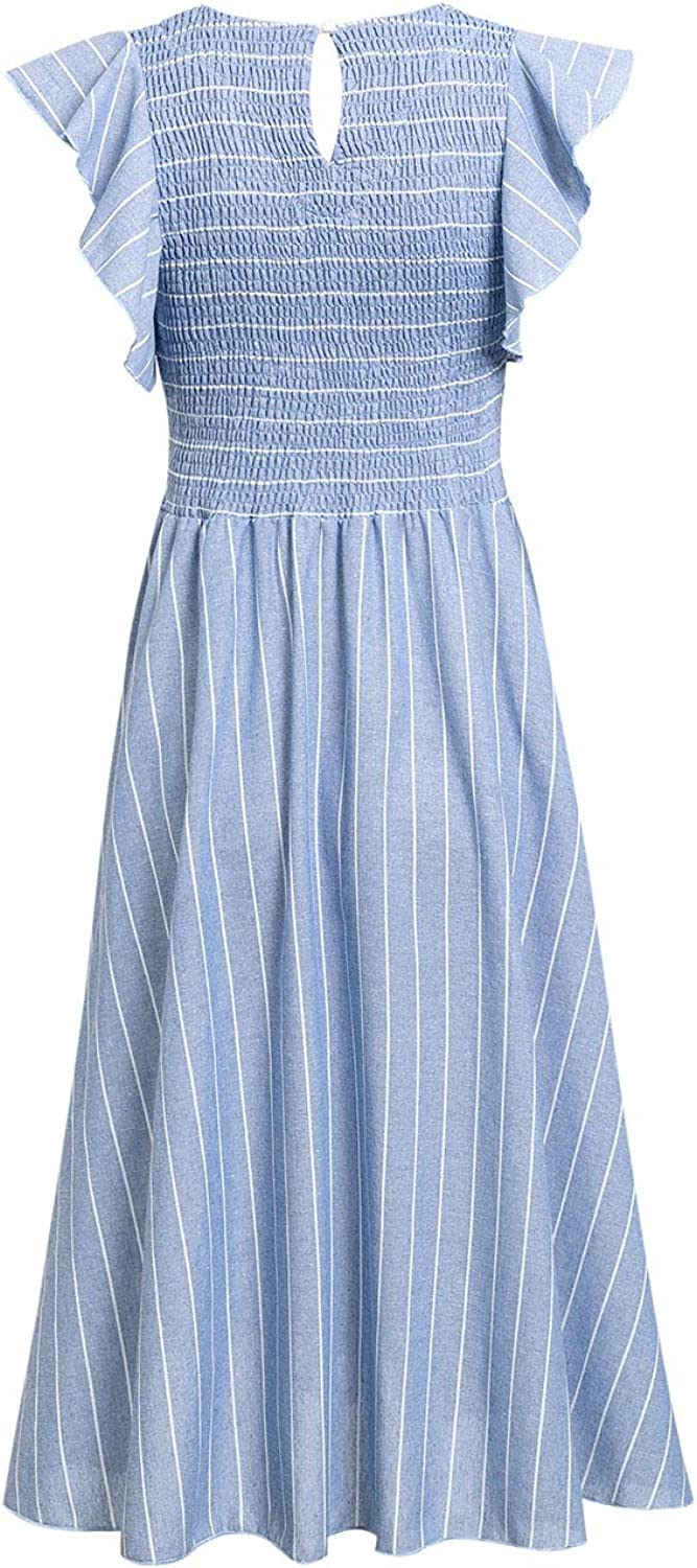 Women's Striped Linen Long Dress Elegant Ruffle Cap Sleeves Midi Dress