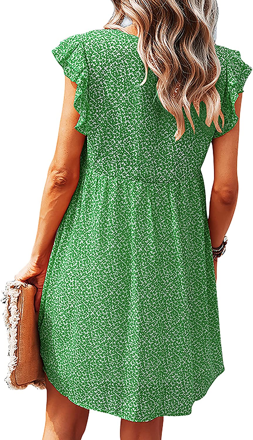 Women's Summer Casual Dress V Neck Ruffle Sleeve Loose Flowy Swing Shift Mini Dress