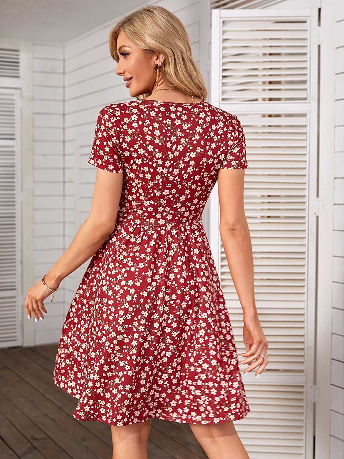 Women's Summer Casual Short Sleeve Wrap V Neck Floral Dress with Pockets