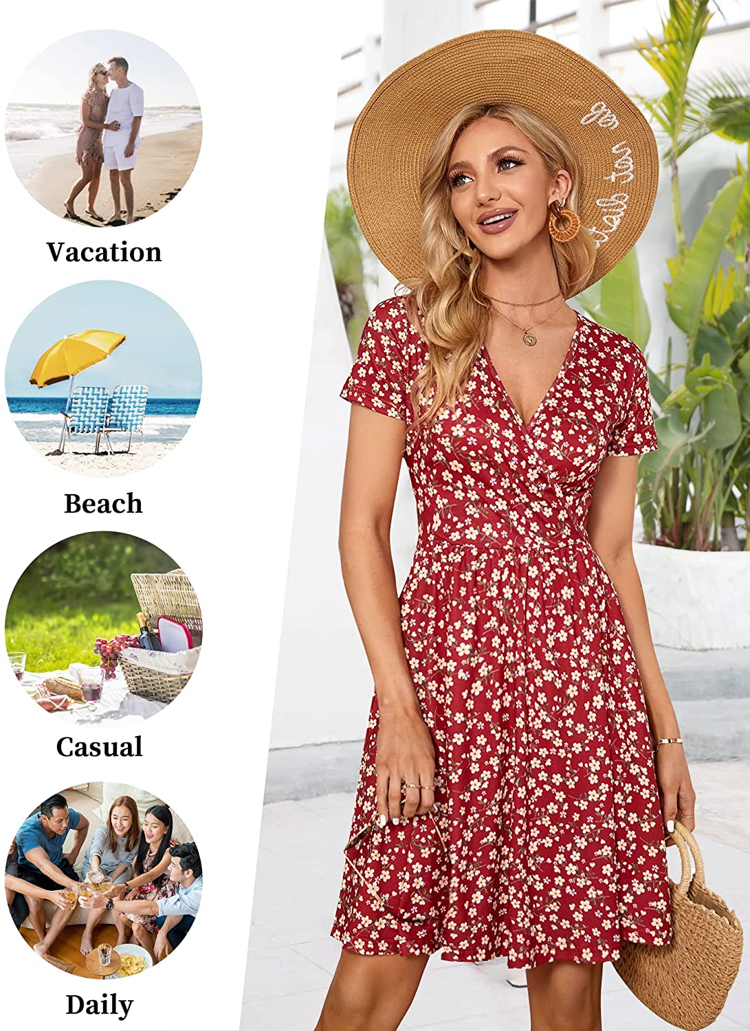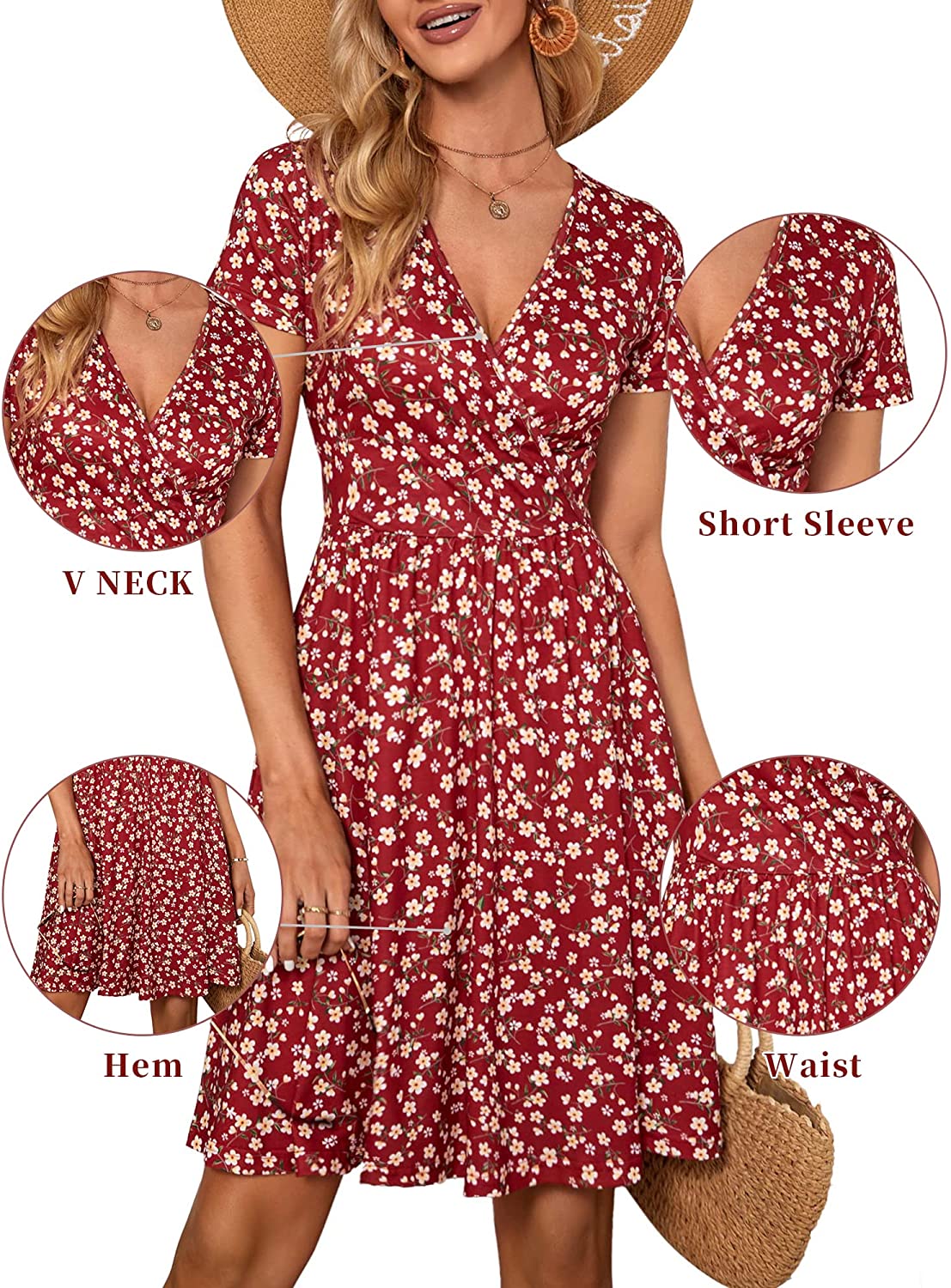 Women's Summer Casual Short Sleeve Wrap V Neck Floral Dress with Pockets