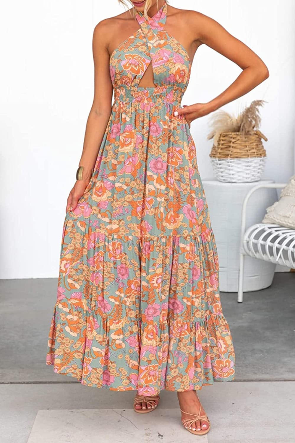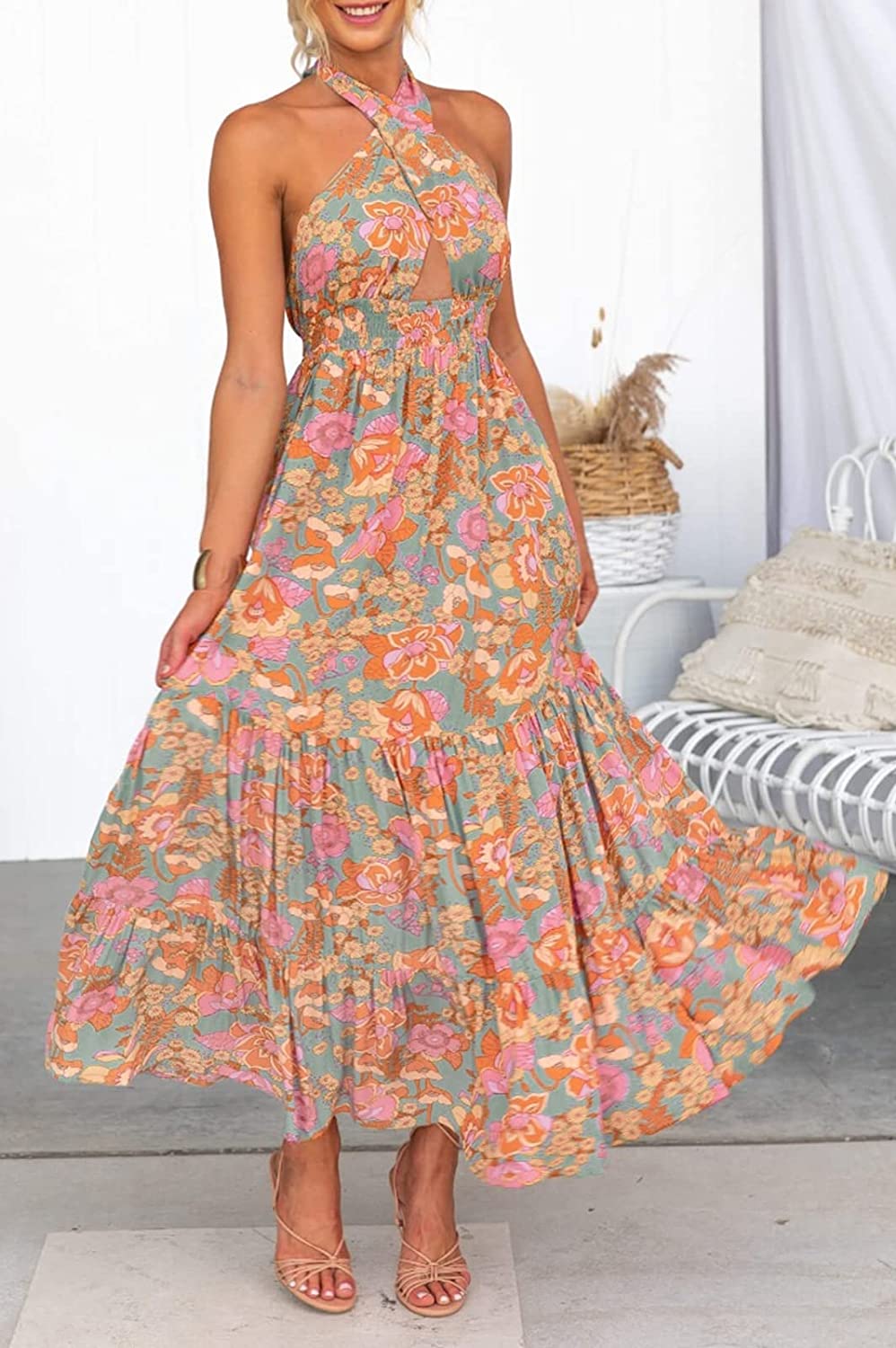 Women's Summer Crossover Halter Neck Sleeveless Plaid Cut Out Backless Flowy A Line Maxi Dress