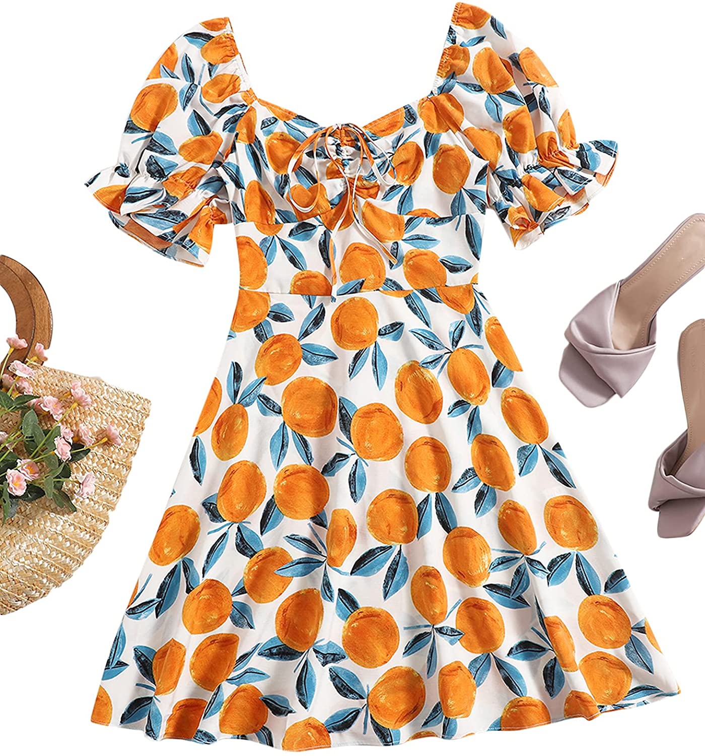 Women's Summer Drawstring Sweetheart Neck Puff Sleeve A Line Short Dress