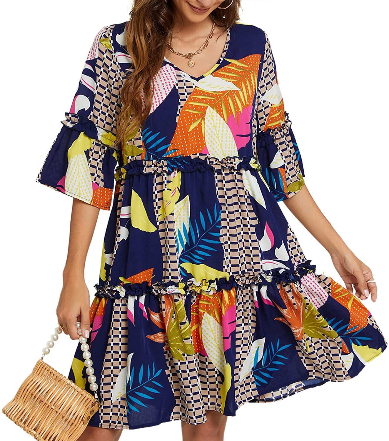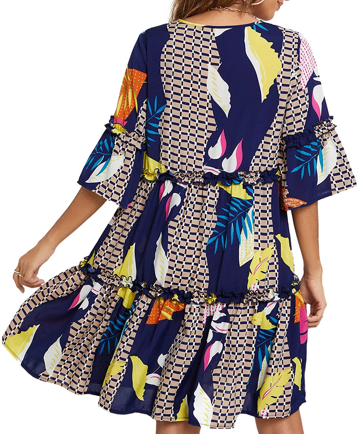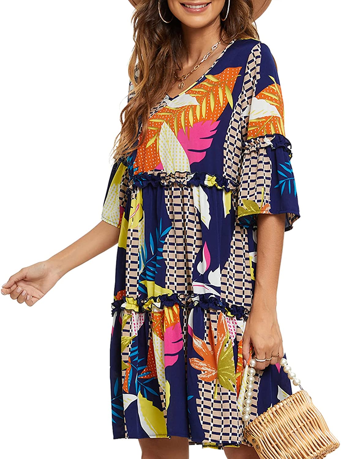 Women's Summer Dresses Flowy Tunic Mini Dress Short Sleeve V Neck Swing Dress