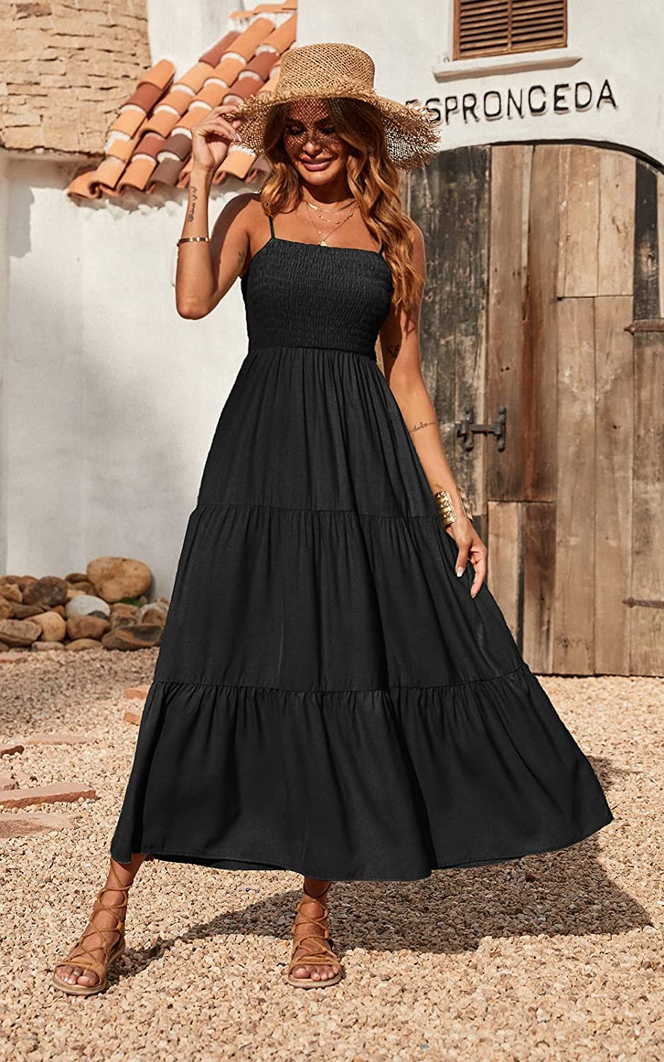 Women's Summer Maxi Dress Casual Boho Sleeveless Spaghetti Strap Smocked Tiered Long Beach Sun Dresses