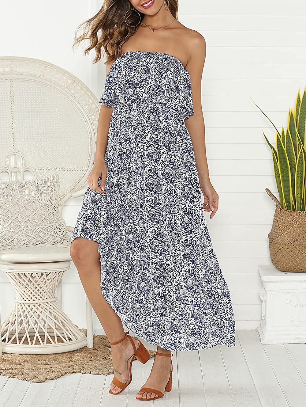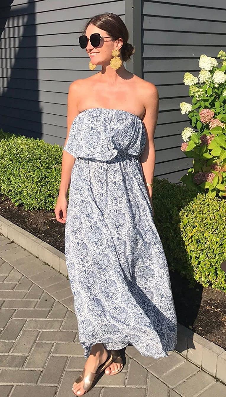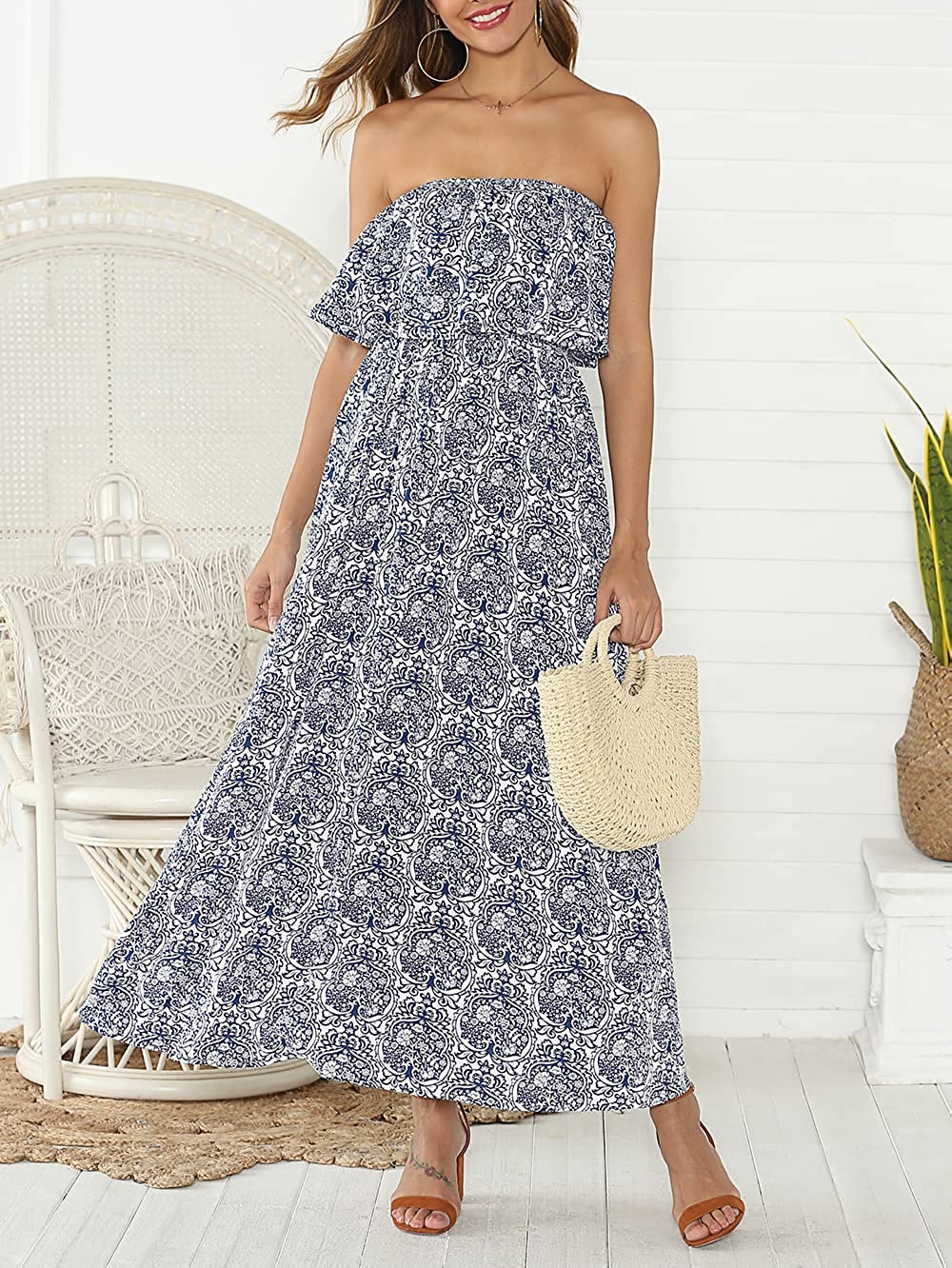 Women's Summer Off The Shoulder Maxi Dress Ruffle Strapless Blue White Porcelain Boho Casual Loose Long Dress