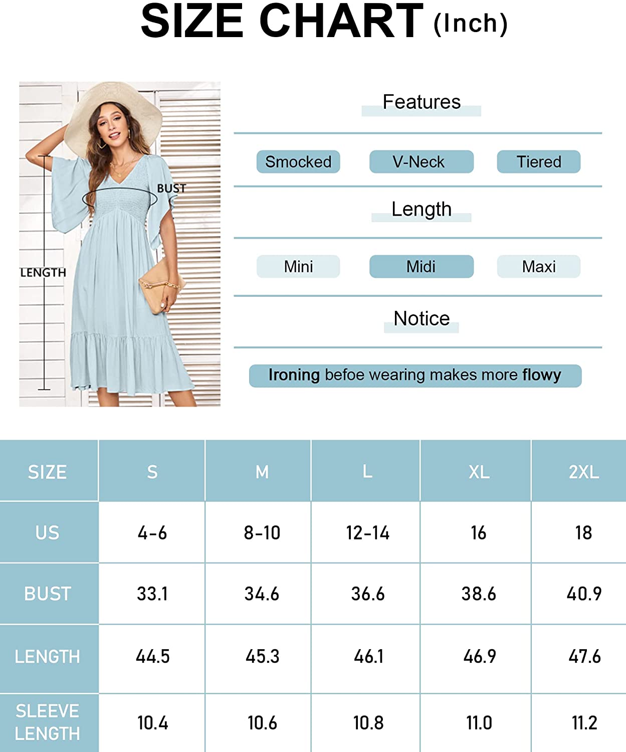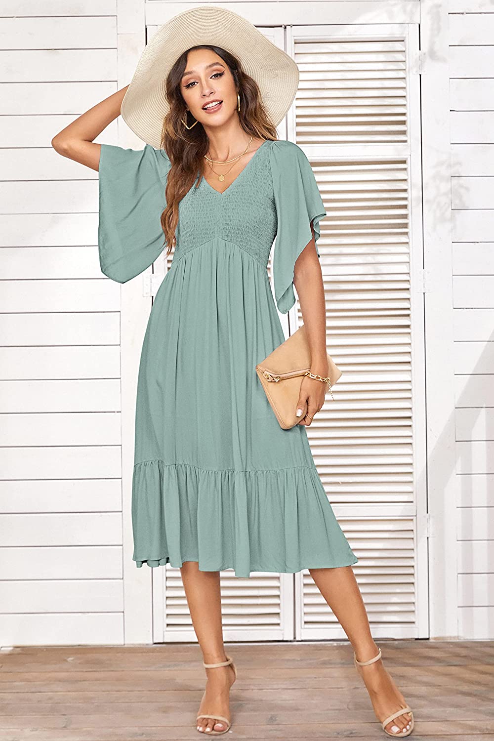 Women's Summer Tiered Dress Smocked Flutter Short Sleeve V Neck Midi Dresses