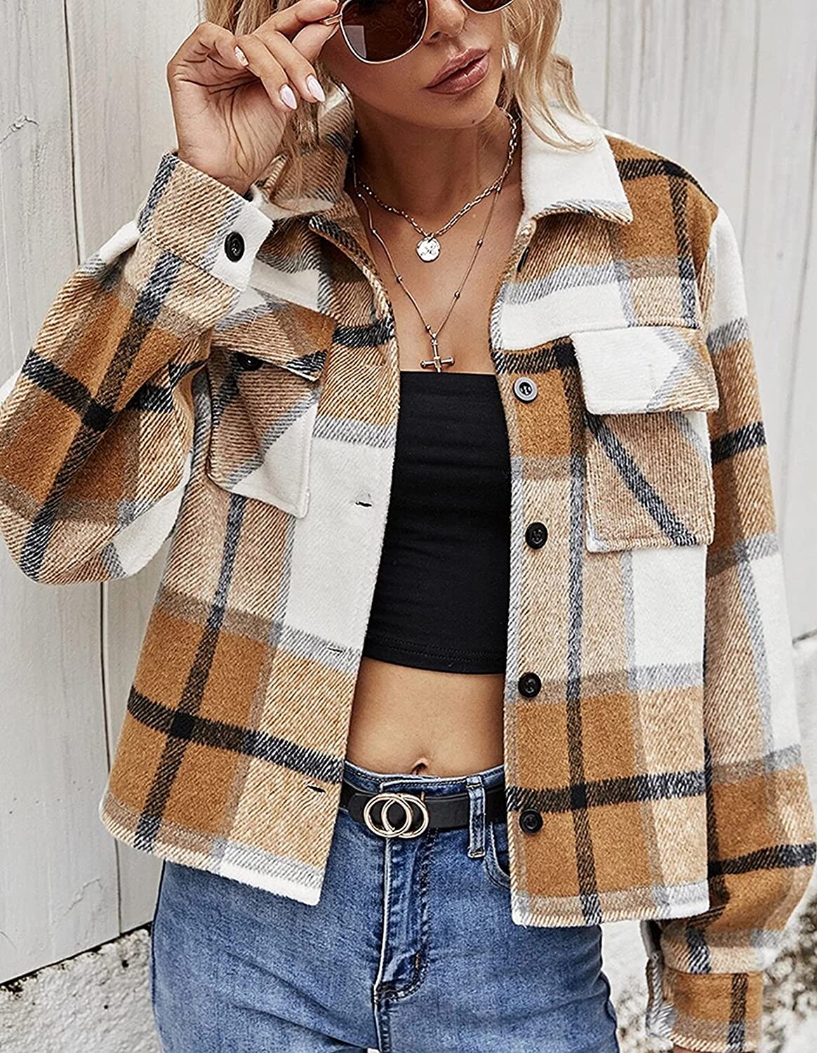Yeokou Women's Fashion Cropped Flannel Wool Blend Plaid Shacket Long Sleeve Button Down Jackets Coat